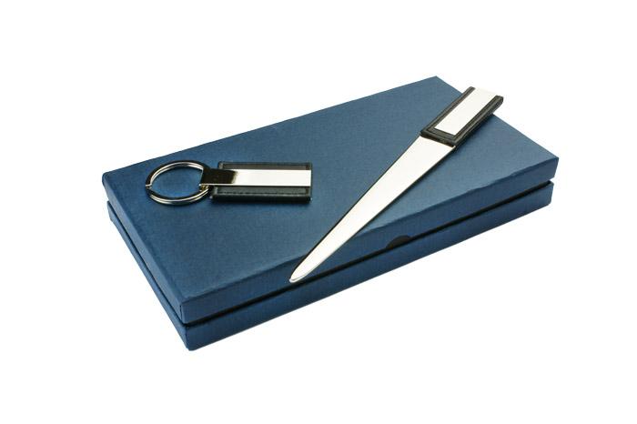 Numer produktu: 17458-02 Praktyczny zestaw upominkowy składający się z nożyka do otwierania listów oraz breloka do kluczy. Oba elementy wykończone są ekoskórą PU i zapakowane w eleganckie pudełko. Logo wygrawerujemy na powierzchni elementów. Wymiary produktu: 197 x 97 mm (opakowanie) Opakowanie produktu: rękaw biały Ilość w kartonie: 20 / 100 Materiał: ekoskóra, metal Kolor produktu: czarny Znakowanie produktu: GS (45 x 10 mm) Znakowanie etui: Strona w katalogu: 76 Cena netto: 12.20 zł/szt.