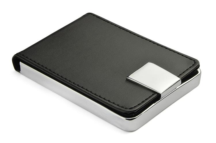 Numer produktu: 17432 Wizytownik z ekoskóry PU z zapięciem na magnes. Pomieści on 12 standardowych wizytówek. Logo grawerujemy na 106j blaszce. Wymiary produktu: 14 x 69 x 98 mm Opakowanie produktu: kartonik czarny Ilość w kartonie: 50 / 200 Materiał: ekoskóra, metal Kolor produktu: czarny Znakowanie produktu: GS (16 x 22 mm) Znakowanie etui: nie dotyczy Strona w katalogu: 80 Cena netto: 10.80 zł/szt.
