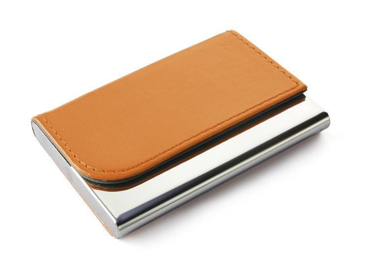 Numer produktu: 17519-07 Elegancki wizytownik z ekoskóry PU z zapięciem na magnes. Mieści 20 wizytówek. Logo tłoczymy lub grawerujemy na powierzchni z ekoskóry. Wymiary produktu: 63 x 93 x 14 mm Opakowanie produktu: kartonik czarny Ilość w kartonie: 50 / 200 Materiał: ekoskóra, metal Kolor produktu: pomarańczowy Znakowanie produktu: GS (9 x 55 mm), MD (25 x 60 mm), T (25 x 60 mm) Znakowanie etui: nie dotyczy Strona w katalogu: 80 Cena netto: 9.80 zł/szt.